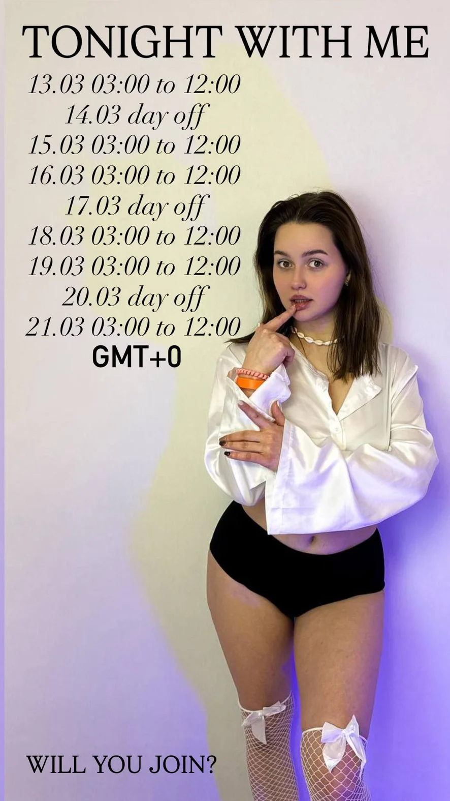 Yoga, Tacchi, Istruzioni per sborrare, Umiliazione, Valutazione del cazzo, Massaggio, Tittyfuck, Orgasmo, Donna sopra, Giochi di ruolo, Feticismo dei piedi, Sculacciate, Ahegao, Zoccolo di cammello, Mistress, Linguaggio esplicito, Pecorina, Esibizionismo, Twerk, Ballo erotico, Spettacolo con olio